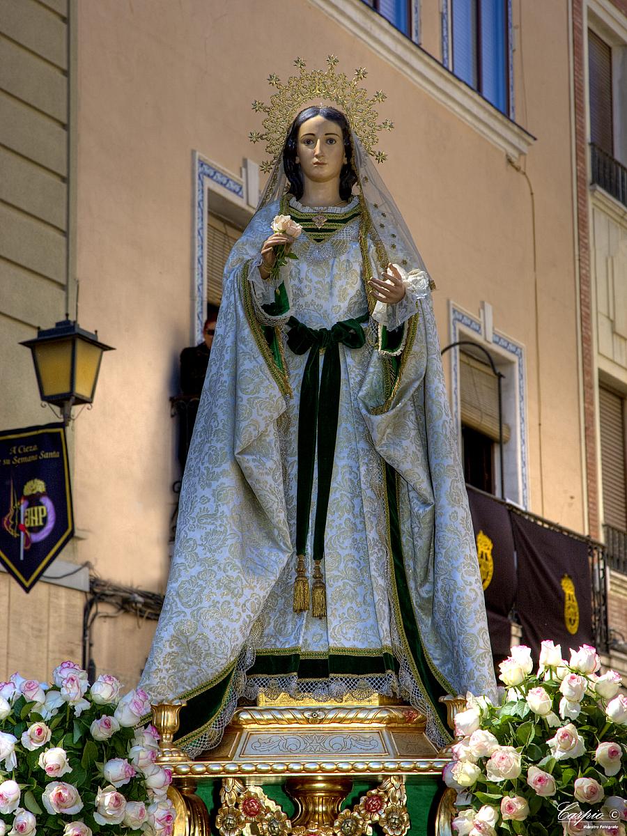 Después de que les fueran aprobados sus Estatutos en 1976, el Obispo de la Diócesis les autorizó a procesionar en la Procesión del Resucitado la mañana del Domingo de Resurrección con la Santísima Virgen del Amor Hermoso, una talla realizada en 1940 por el escultor murciano Juan González Moreno, propiedad de Dña. Josefina Marín-Blázquez, que cuenta con capilla propia en la Basílica de Nuestra Señora de la Asunción y cuyo traslado se sigue celebrando con anterioridad a la Procesión desde la Ermita de San Bartolomé; el trono sobre el que desfila fue realizado a finales del siglo XIX por el Maestro Cañamón para la Imagen de Santa María Magdalena. Imagen y trono han sido objeto de restauración recientemente: la Imagen en 1997, por Javier Bernal Casanova; el trono en el año 2002, por Bonifacio Pérez Ballesteros.