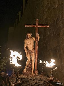 La Cofradía viste túnica confeccionada de arpillera, ceñida por un cíngulo de esparto, sandalias y un gorro de 'verdugo' negro sujeto al cuello por un dogal. Su desfile está presidido por una Cruz guía de madera, realizada por los propios Cofrades, y por un incensario de forja que, portado por cuatro de ellos, desfila entre las dos hileras de penitentes que con sus antorchas iluminan el recorrido de la Procesión.