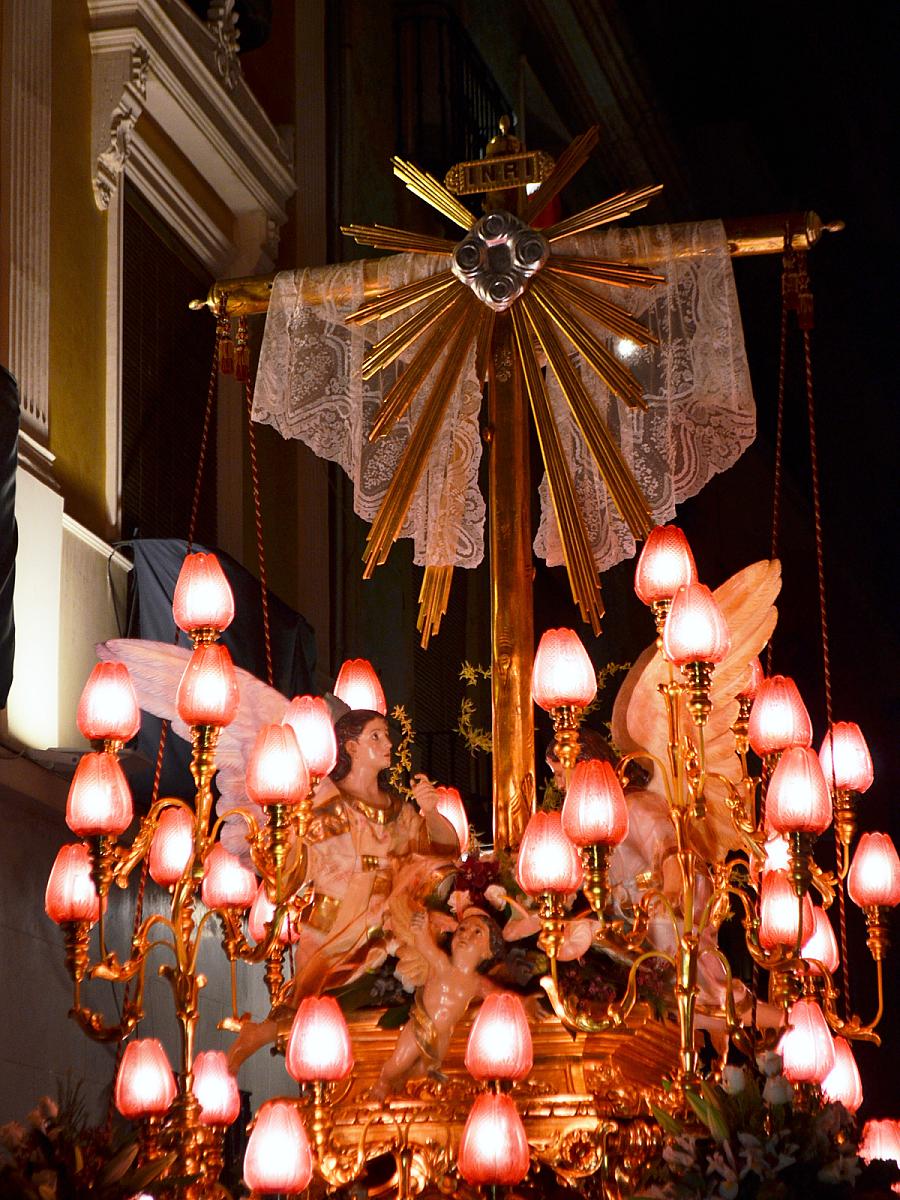 El trono sobre el que procesiona, construido entre 1874 y 1875 por los maestros carpinteros Pedro Herrera y Juan Moreno Rodríguez según diseño de José María Punisse y dorado por Ignacio Amoraga Latorre, así como sus famosas 'bombas' rojas se realizaron bajo la mayordomía y camarería de D. Mariano Marín-Blázquez y Marín-Blázquez y de su esposa Dña. María Luisa Fernández de Castro y Martínez-Illescas respectivamente, que habían sucedido en el cargo a sus primeros Hermano Mayor y Camarera; remozado por Pujante en 1940 y nuevamente dorado en 1987 en Murcia en los talleres de los Hermanos Lorente, el año 2003 fue objeto de una última intervención de restauración y dorado por el artista local D. Bonifacio Pérez Ballesteros, quien también limpió las Imágenes de los Ángeles y realizó para el mismo dos años después un juego de puntas de vara talladas en madera y doradas; el trabajo sobre el Trono se completó con un portacampana de metal realizado por el orfebre ciezano Diego Penalva y con el bordado en oro sobre terciopelo rojo de un nuevo juego de galas por las Religiosas Justinianas Madres de Dios de Murcia.