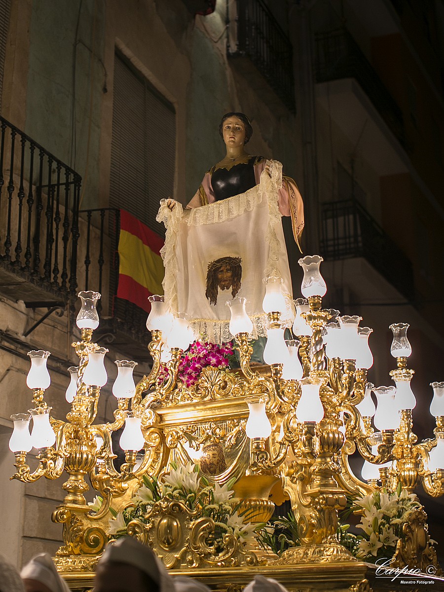 Ese mismo año de 1945 la Cofradía entra en contacto con el escultor Francisco Palma Burgos y le encarga por valor de ocho mil pesetas la restauración de Imagen y trono, así como el dorado completo de este. Un año después vuelve a desfilar el Paso de la Santa Verónica, que no lo había hecho en los tres años anteriores, y se nombra Camarera a Dña. Josefina Pérez de Tarazona. En esas fechas, el paño con la Santa Faz debido a Ruiz de Sardes, es sustituido por otro obra de Benedito, y éste a su vez alternado desde 1992 por otro regalado por la familia Marín Oliver obra de la pintora ciezana María Jesús Castañeda.