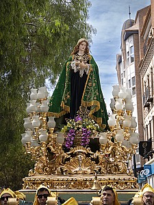 El primitivo trono, algo más pequeño que el actual, fue realizado en 1893 por el Maestro Cañamón, tallista ciezano que debido a las pequeñas dimensiones de su taller tuvo que montarlo en plena calle, y fue dorado por 'Perico el pintor'. El que ahora procesiona es una obra tallada en madera y dorada por el escultor malagueño afincado en Cieza Juan Solano García, a quien le fue encargado en 1953 por la Cofradía estrenándose el año siguiente; fue restaurado en el año 2000 por Bonifacio Pérez Ballesteros, a excepción de los brazos de luz que lo fueron en el año 2003 en el taller de Domingo García Chauán en Albatera y de las puntas de vara que fueron talladas en madera y doradas en Sevilla por Antonio Ibáñez Valles en 2006, y completado con un nuevo juego de galas bordadas en oro sobre terciopelo por las propias Hermanas en 1999.
