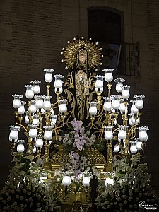 Las primeras andas, cuyos datos artísticos y autoría desconocemos, fueron sustituidas por unas nuevas "con obra de talla, con quatro niños de talla, doradas, y los demas requisitos que se necesitasen" en 1731, por otras en 1784, y por unas terceras "con tallas y doradas" en 1856; pero el trono en el que actualmente procesiona se debe al Maestro Pujante, quien lo realizó a finales del siglo pasado; sujeto a varias restauraciones, destacar la que contempló un nuevo dorado del mismo, realizada en 1992 por el escultor ciezano-malagueño Juan Solano.