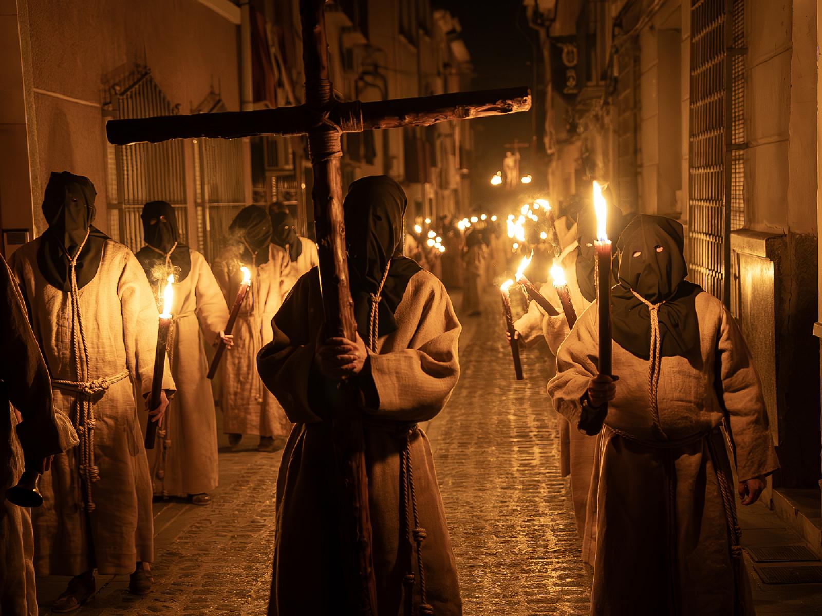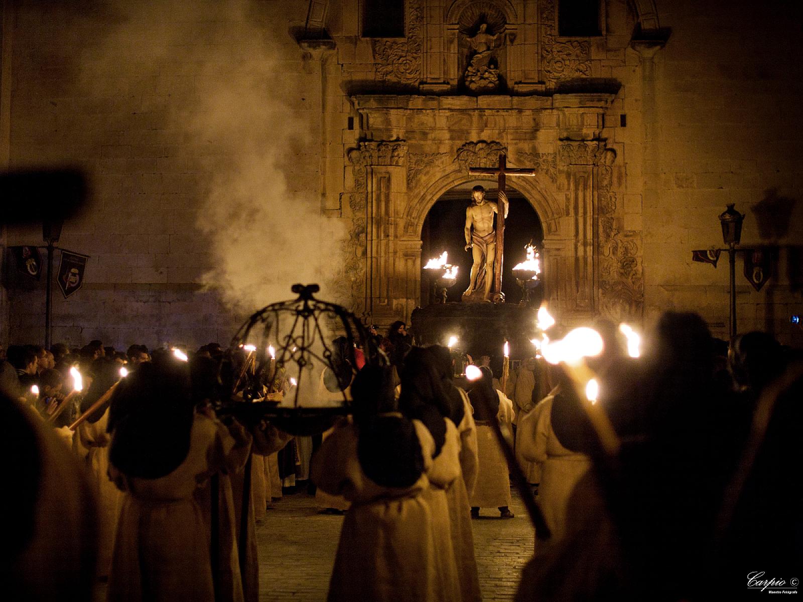 Esta singularísima procesión tiene sus preámbulos en el juramento de silencio que realizan los cofrades en la Ermita de San Bartolomé. Desde allí el tercio de nazarenos, con sus inconfundibles túnicas de saco y portando antorchas, se dirige hacia la Basílica de Nuestra Señora de la Asunción, cuyas puertas, en respuesta a la llamada que la cofradía realiza con su cruz guía, se abren para descubrir el paso de Jesús abriendo las puertas de los infiernos.