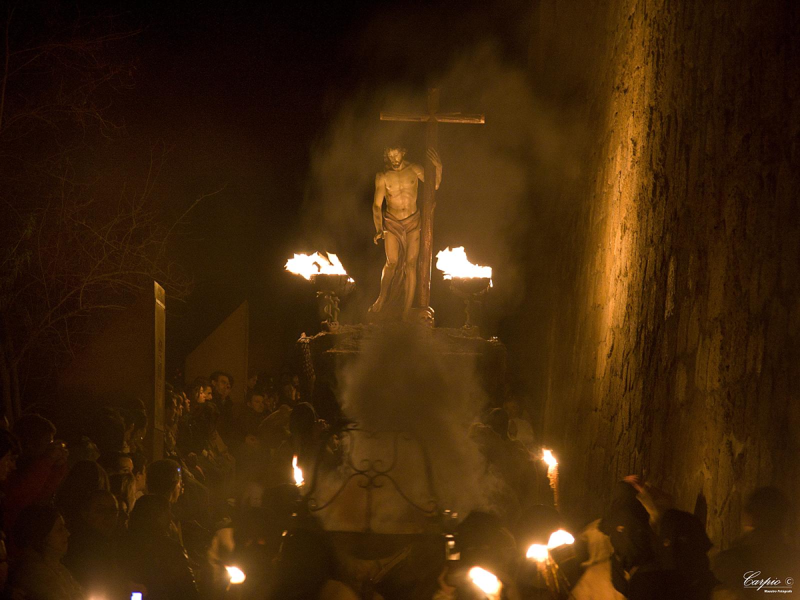 En ese ambiente, propio del medievo, el paso, a la luz del fuego de sus cuatro pebeteros y al son que marca un solo tambor sordo, cuya monótona cadencia tan sólo se ve interrumpida por un grupo de cámara o las voces de una coral que interpreta cánticos sacros como Signore delle Cime en enclaves determinados, recorre su singular itinerario para recogerse a altísimas horas de la madrugada, cercano ya el alba del Sábado Santo.