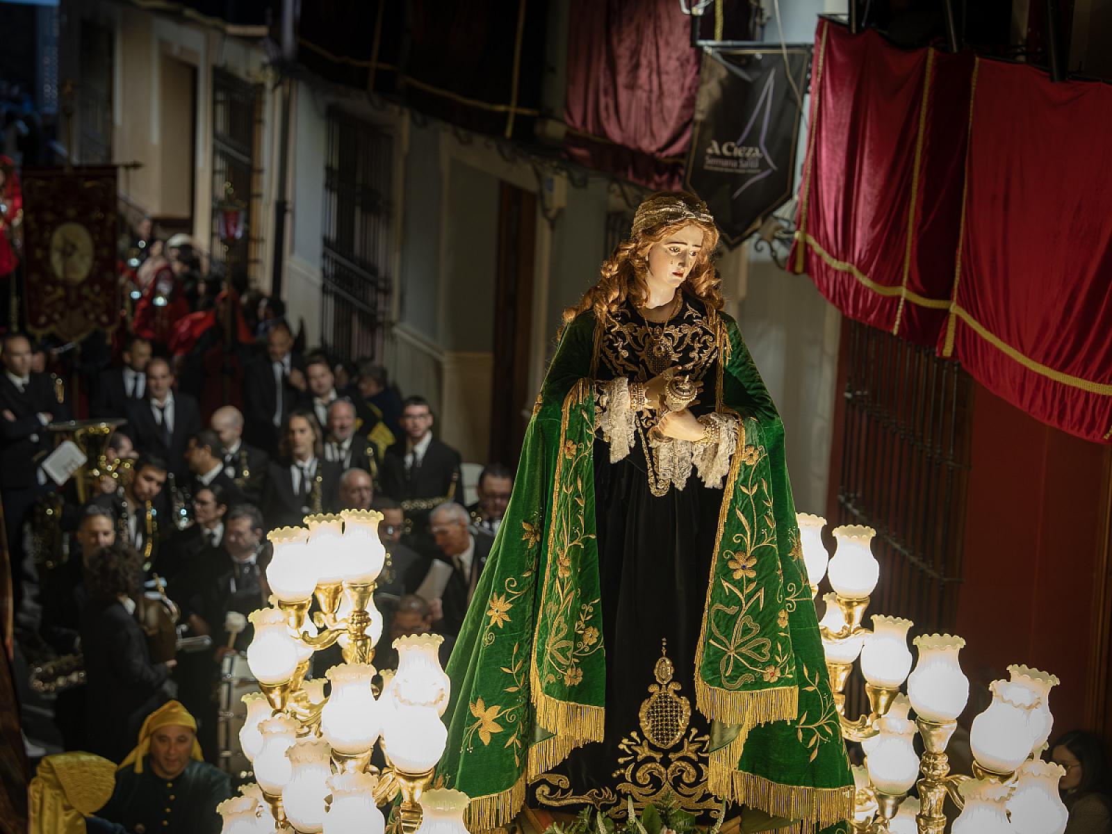 Dentro del importante patrimonio que esa noche se pone en la calle, es imposible obviar la relevancia de la talla de San Pedro, del gran imaginero Palma Burgos, y del trono en el que desfila, realizado por Rubio Valverde; del grupo escultórico de la Flagelación, con el Cristo de González Moreno, así como la excelencia imaginera del grupo escultórico de la Coronación de Espinas, del cordobés Romero Zafra; y de la imagen del Ecce-Homo, la última y regia obra procesional que tallara González Moreno, sin olvidar las bellas imágenes decimonónicas de la Santa Verónica y Santa María Magdalena. Todas ellas, junto a las ya mencionadas del Santísimo Cristo del Perdón y de la Santísima Virgen de los Dolores, y a la antiquísima y devota imagen del Santísimo Cristo del Consuelo, figuran entre las obras más importantes del patrimonio imaginero de la Semana Santa de Cieza.